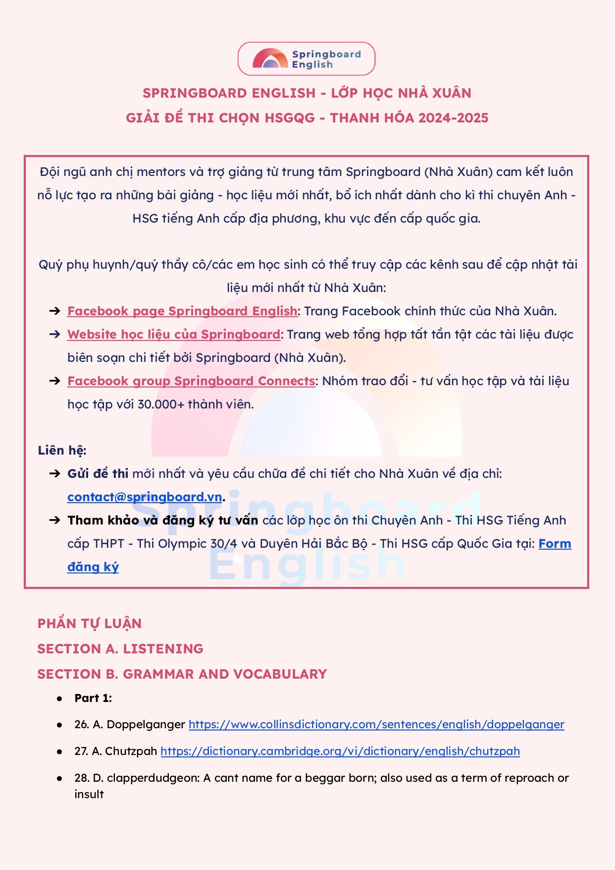 - Gửi đề thi mới nhất và yêu cầu chữa đề chi tiết cho Nhà Xuân về địa chỉ: contact@springboard.vn