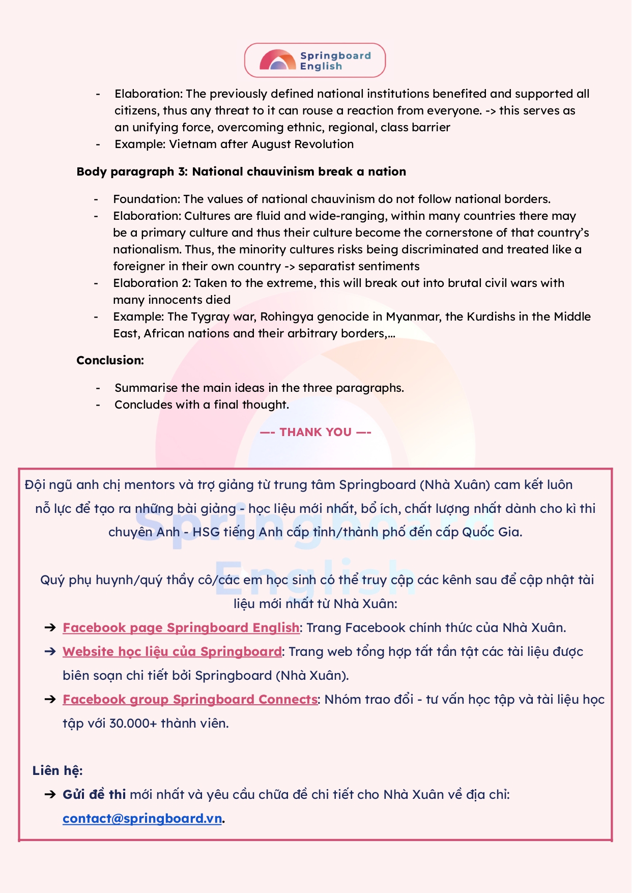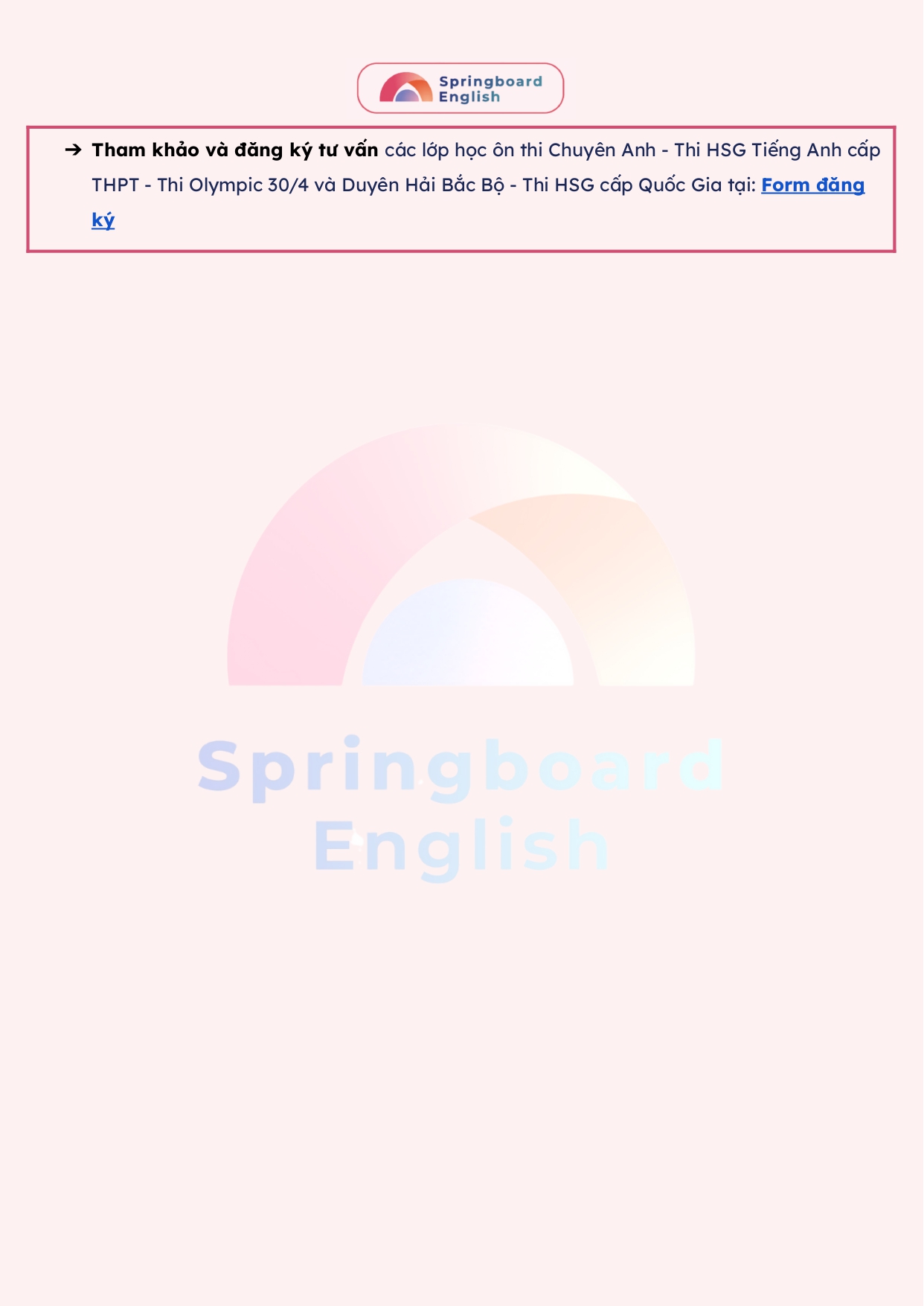Đội ngũ anh chị mentors và trợ giảng từ trung tâm Springboard (Nhà Xuân) cam kết luôn nỗ lực tạo ra những bài giảng – học liệu mới nhất, bổ ích nhất dành cho kì thi chuyên Anh – HSG tiếng Anh từ cấp địa phương, khu vực đến cấp quốc gia.
