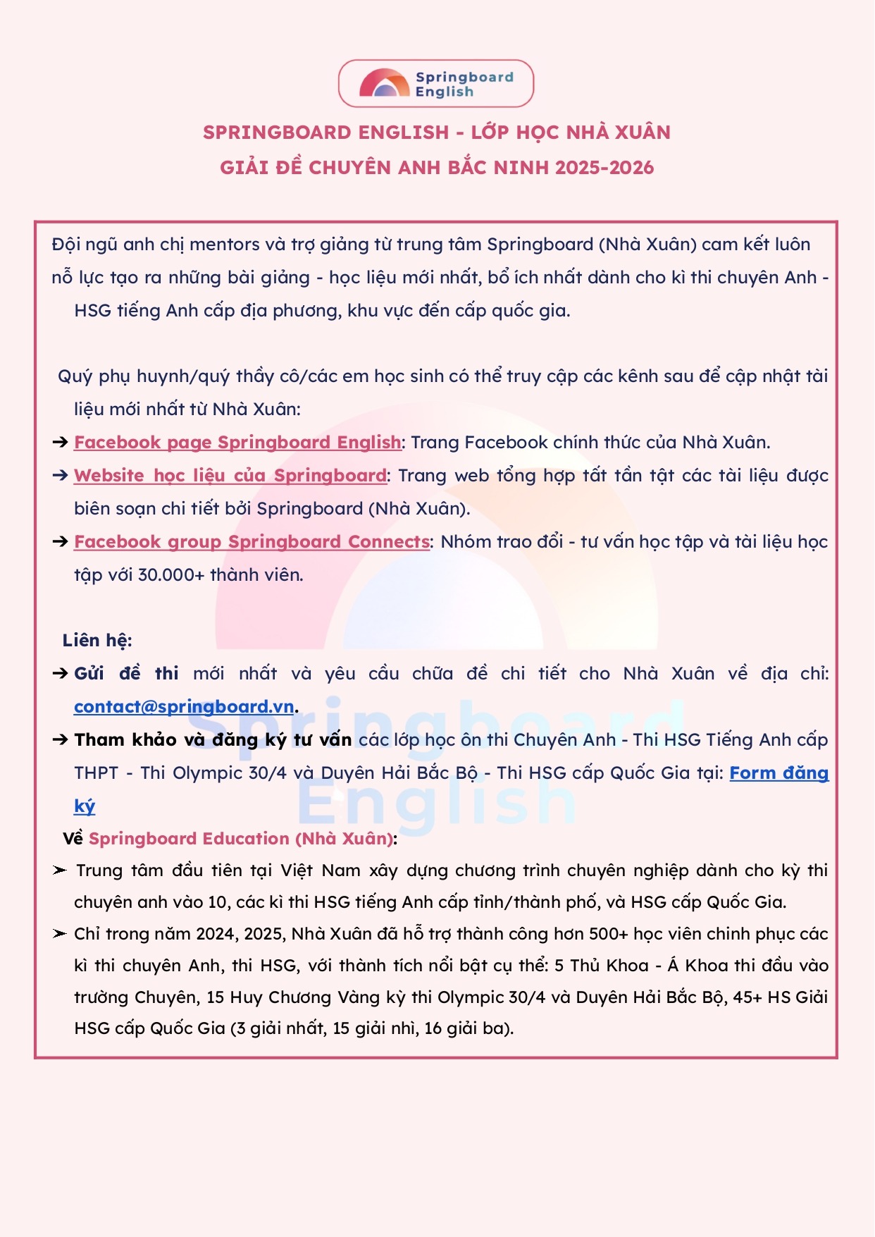 Đội ngũ anh chị trung tâm Springboard (Nhà Xuân) xin gửi đến các quý phụ huynh, thầy cô, các em học sinh tổng hợp đề thi và đáp án đề thi Chuyên Anh vào lớp 10 tỉnh BẮC NINH, thi vào THPT Chuyên Bắc Ninh năm 2025-2026 (có đáp án và giải thích chi tiết).