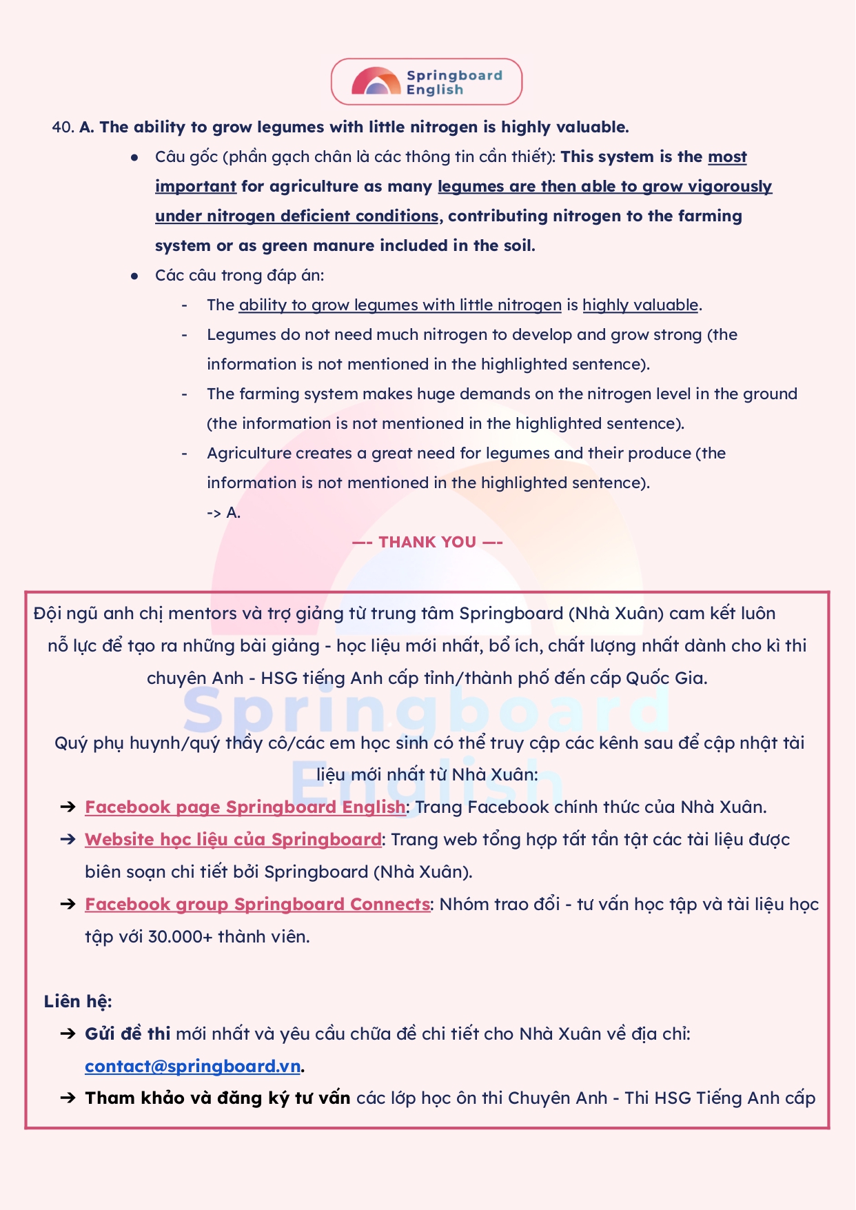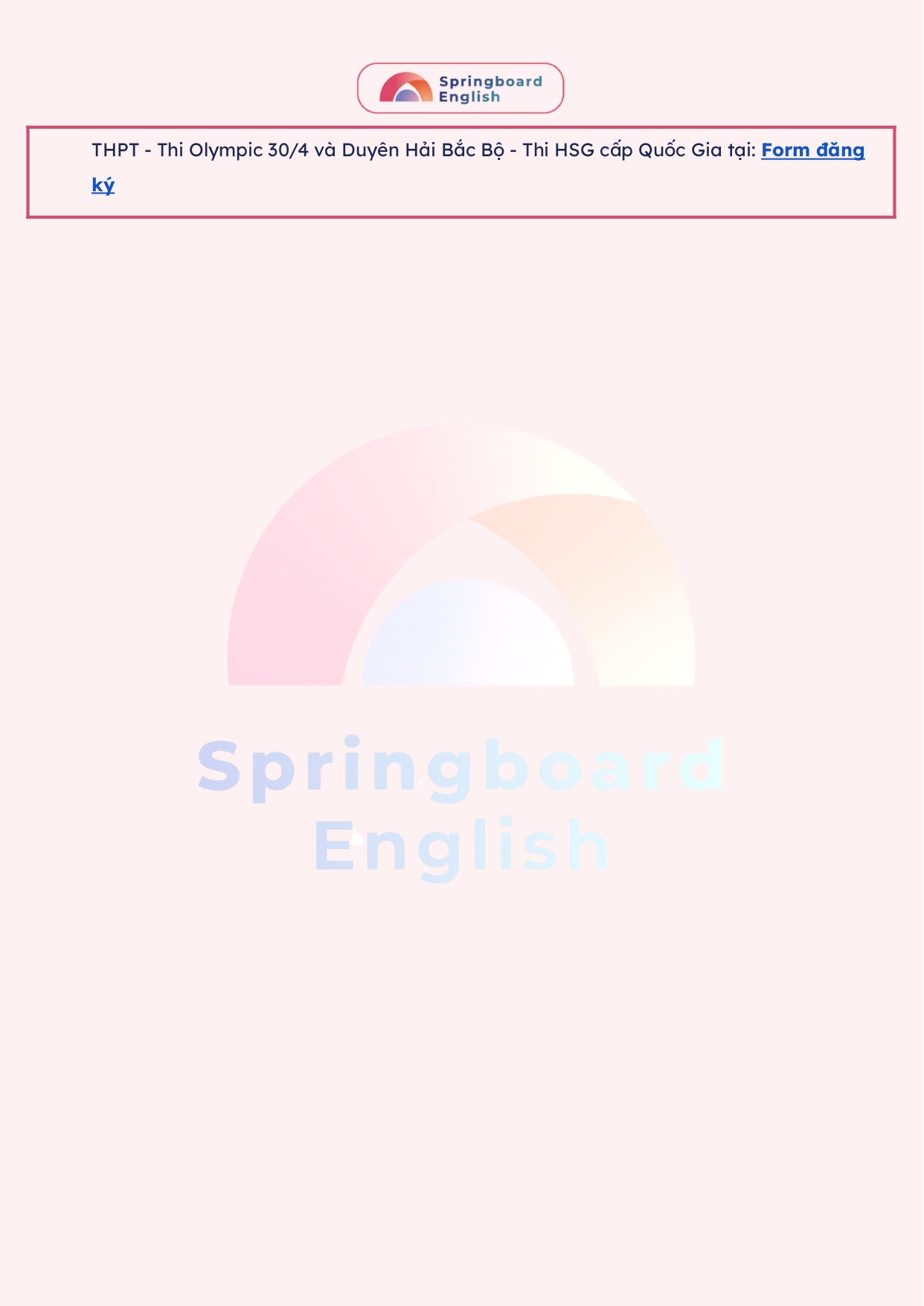 Với nỗ lực để luôn tạo ra những bài giảng – học liệu hay nhất dành cho kì thi chuyên Anh – HSG tiếng Anh cấp tỉnh/thành phố đến cấp Quốc Gia, đội ngũ mentors trung tâm Springboard (Nhà Xuân) luôn biên soạn những tài liệu mới nhất với giải thích tận tâm – chi tiết.