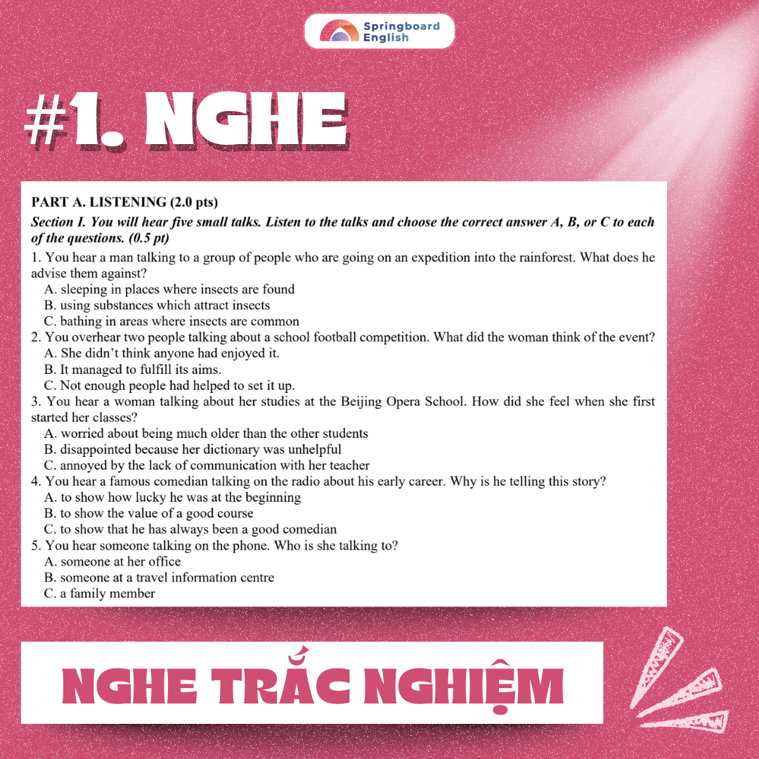 Phát triển khả năng nghe hiểu đa lớp, phản xạ chọn đáp án nhanh và chính xác — kỹ năng cốt lõi trong cả đề Chuyên Anh và đề IELTS Listening.