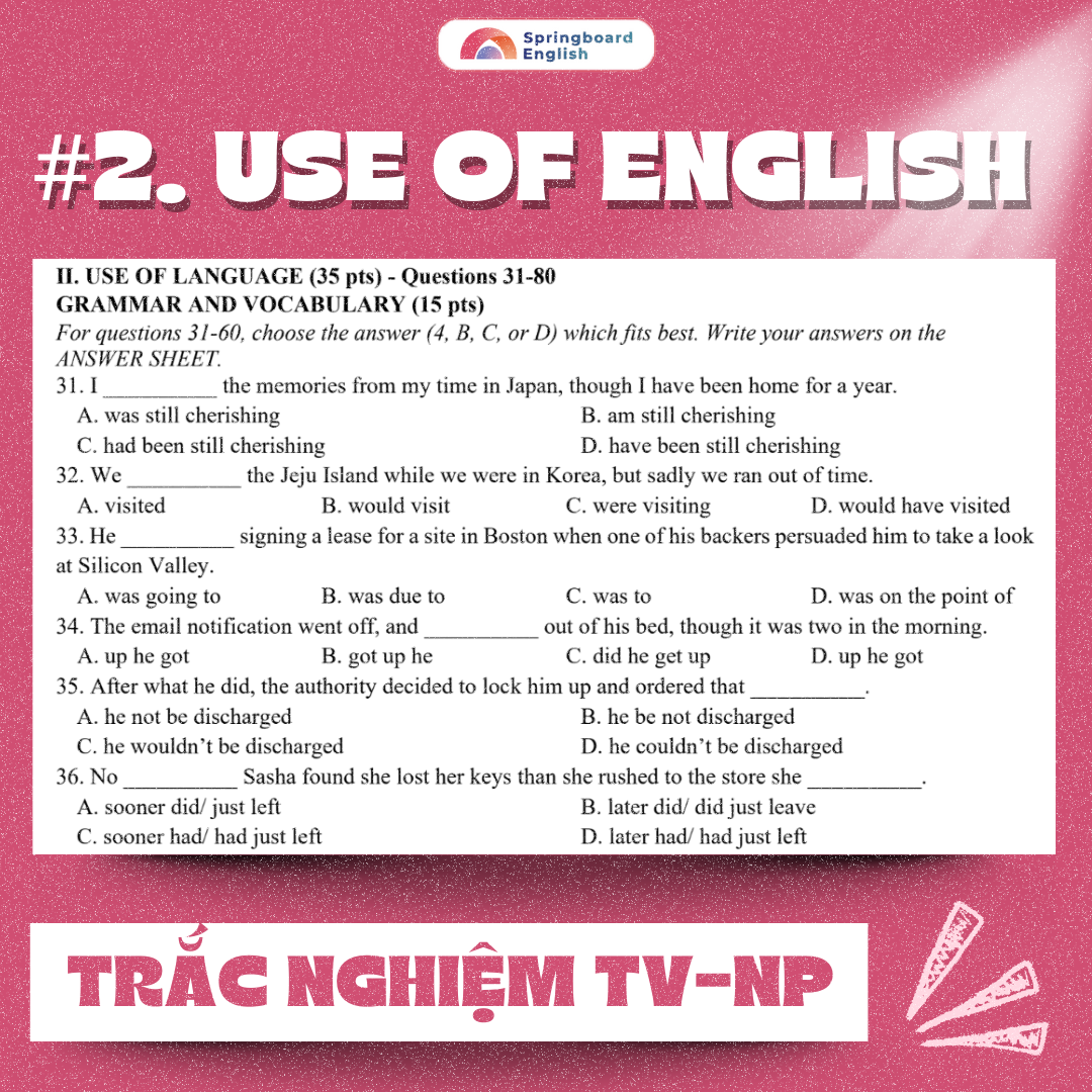 Là dạng bài phổ biến nhất trong phần Use of English ở các kỳ thi Chuyên Anh và HSG Anh. Mỗi câu hỏi gồm một câu chưa hoàn chỉnh và bốn lựa chọn (A, B, C, D). Thí sinh cần chọn phương án đúng nhất để hoàn thiện câu, đảm bảo cả ngữ pháp, nghĩa và cách dùng tự nhiên trong tiếng Anh chuẩn học thuật.