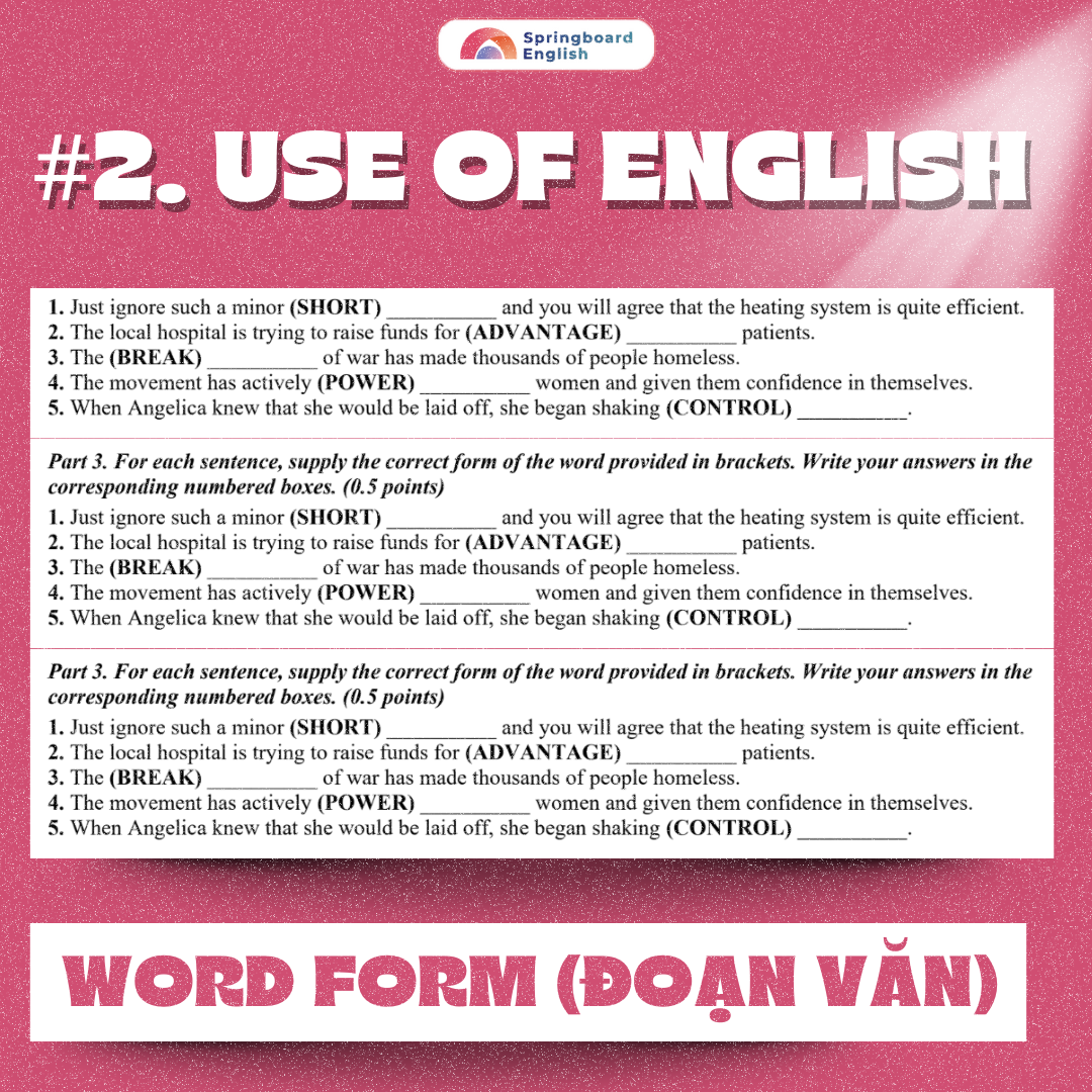 Là dạng bài yêu cầu thí sinh biến đổi dạng của từ cho sẵn trong ngoặc để hoàn thiện câu hoặc đoạn văn sao cho đúng ngữ pháp, ngữ nghĩa và cấu trúc ngôn ngữ. Mỗi ô trống chỉ được điền một từ duy nhất, thường dựa trên gốc danh từ, động từ, tính từ hoặc trạng từ đã cho.