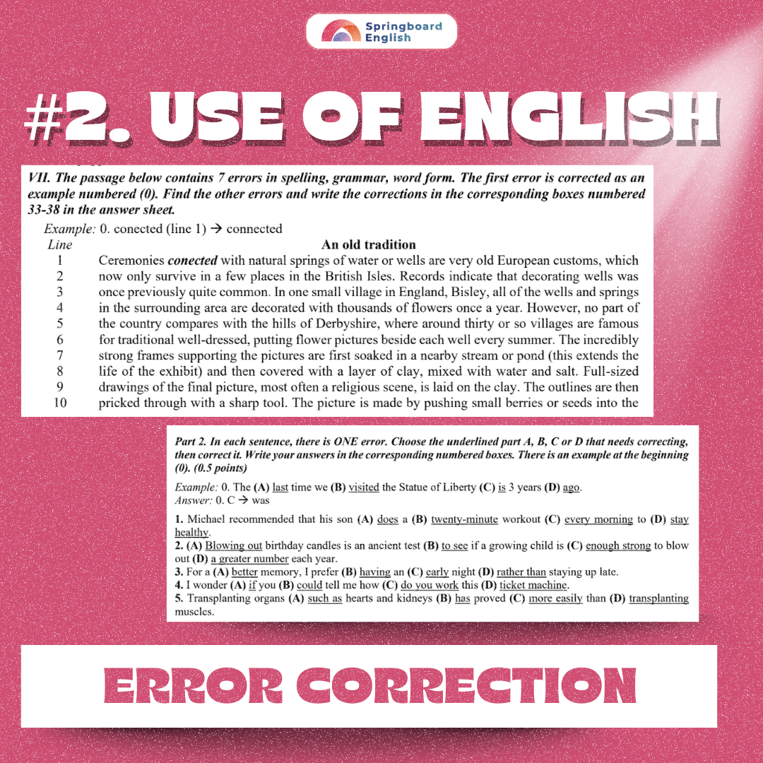Là dạng bài yêu cầu thí sinh phát hiện và sửa lỗi sai trong một đoạn văn hoặc trong các câu độc lập. Mỗi bài thường có từ 5–10 lỗi sai liên quan đến ngữ pháp, từ vựng, chính tả, hoặc hình thái từ, và thí sinh cần ghi lại dạng đúng tương ứng. Ở một số tỉnh/thành, đề Chuyên Anh và đề HSG chỉ yêu cầu phát hiện lỗi và không cần sửa lỗi sai.