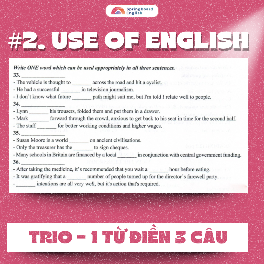 Là dạng bài yêu cầu thí sinh tìm một từ duy nhất có thể dùng đúng ngữ pháp và hợp nghĩa trong cả 3 câu. Dạng này đòi hỏi khả năng hiểu sâu đa nghĩa của từ (polysemy) và sự linh hoạt ngữ pháp ngữ nghĩa trong các ngữ cảnh khác nhau.