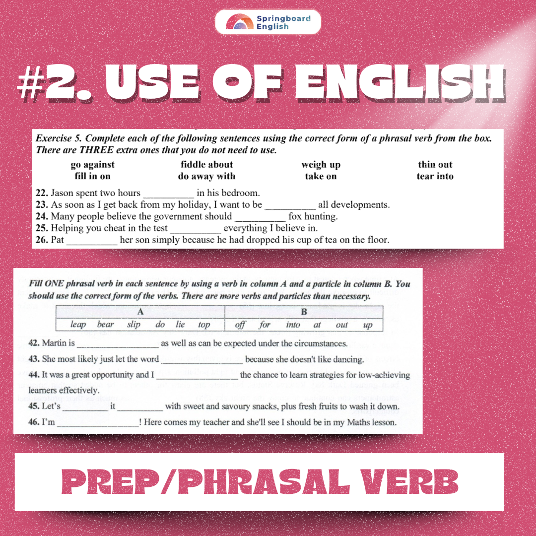 Phần 2: Phrasal Verbs: hoàn chỉnh cụm động từ bằng cách chọn đúng động từ + tiểu từ (particle) hoặc sử dụng đúng dạng của cụm động từ cho trước.