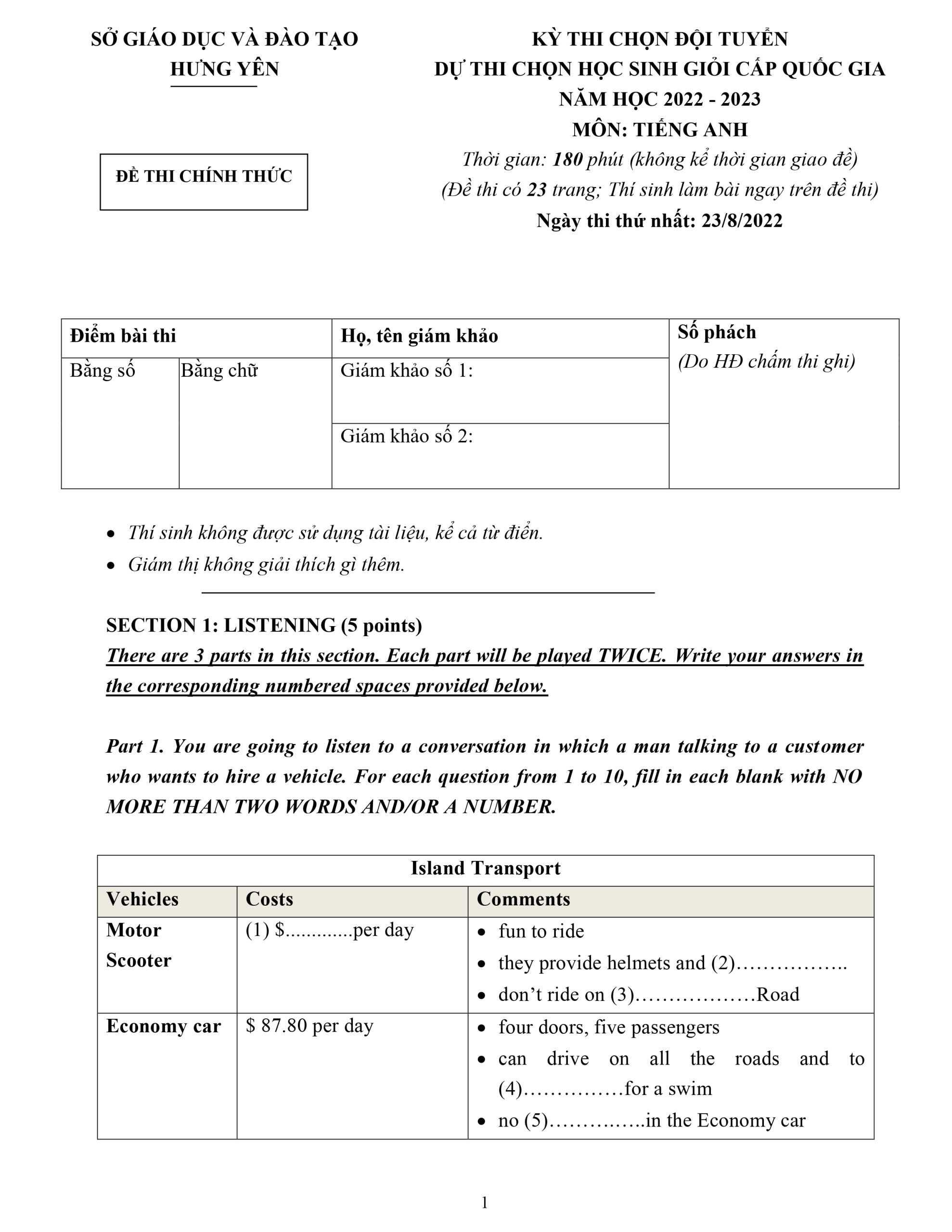 Đề thi chọn đội tuyển HSG Quốc Gia môn tiếng Anh tỉnh Hưng Yên năm 2022-2023.