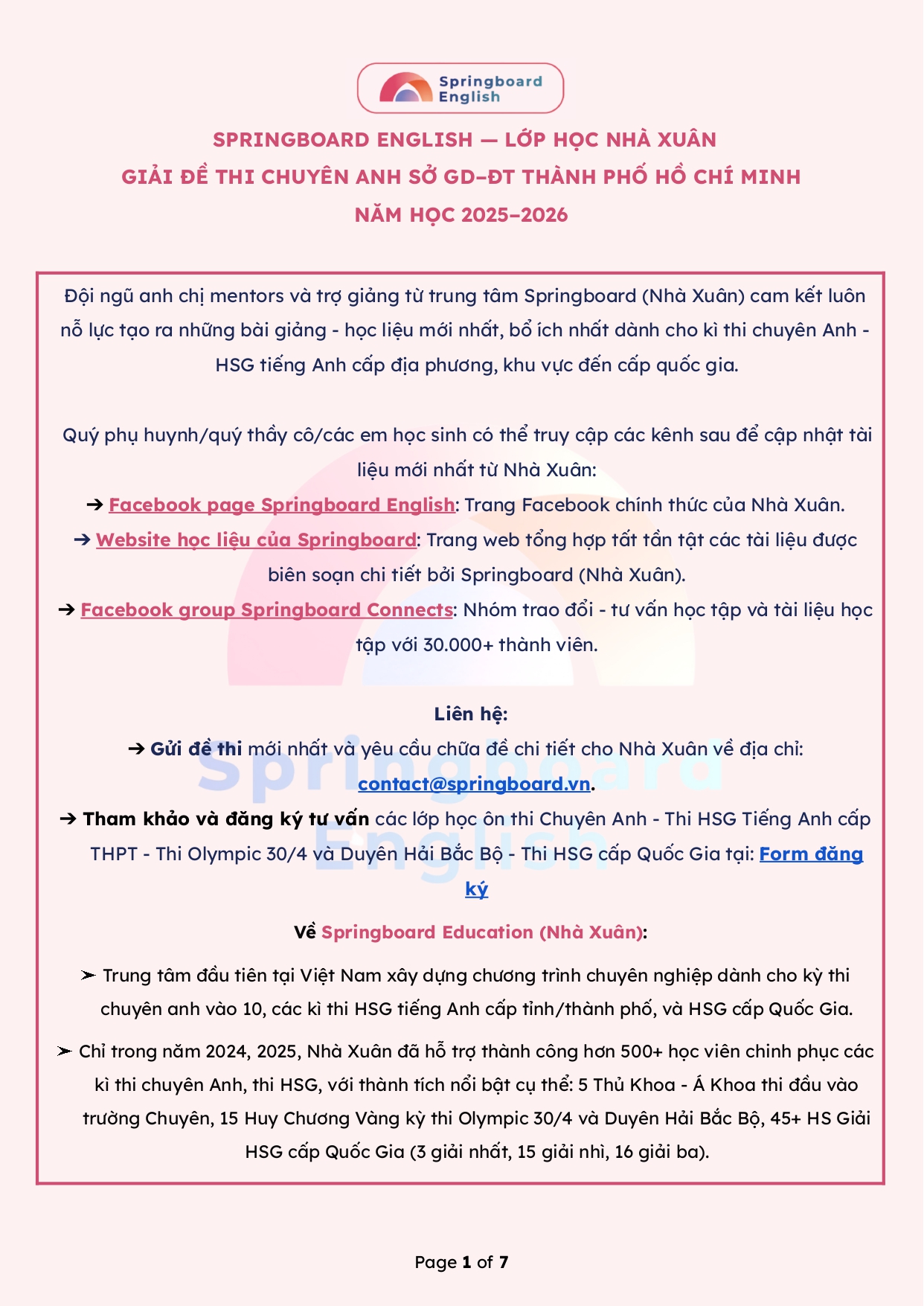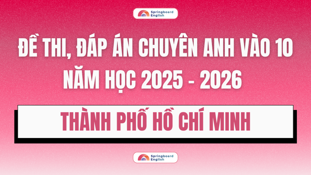 Đội ngũ anh chị trung tâm Springboard (Nhà Xuân) xin gửi đến các quý phụ huynh, thầy cô, các em học sinh tổng hợp đề thi và đáp án đề thi Chuyên Anh vào lớp 10 thành phố Hồ Chí Minh năm 2025-2026 (có đáp án và giải thích chi tiết).