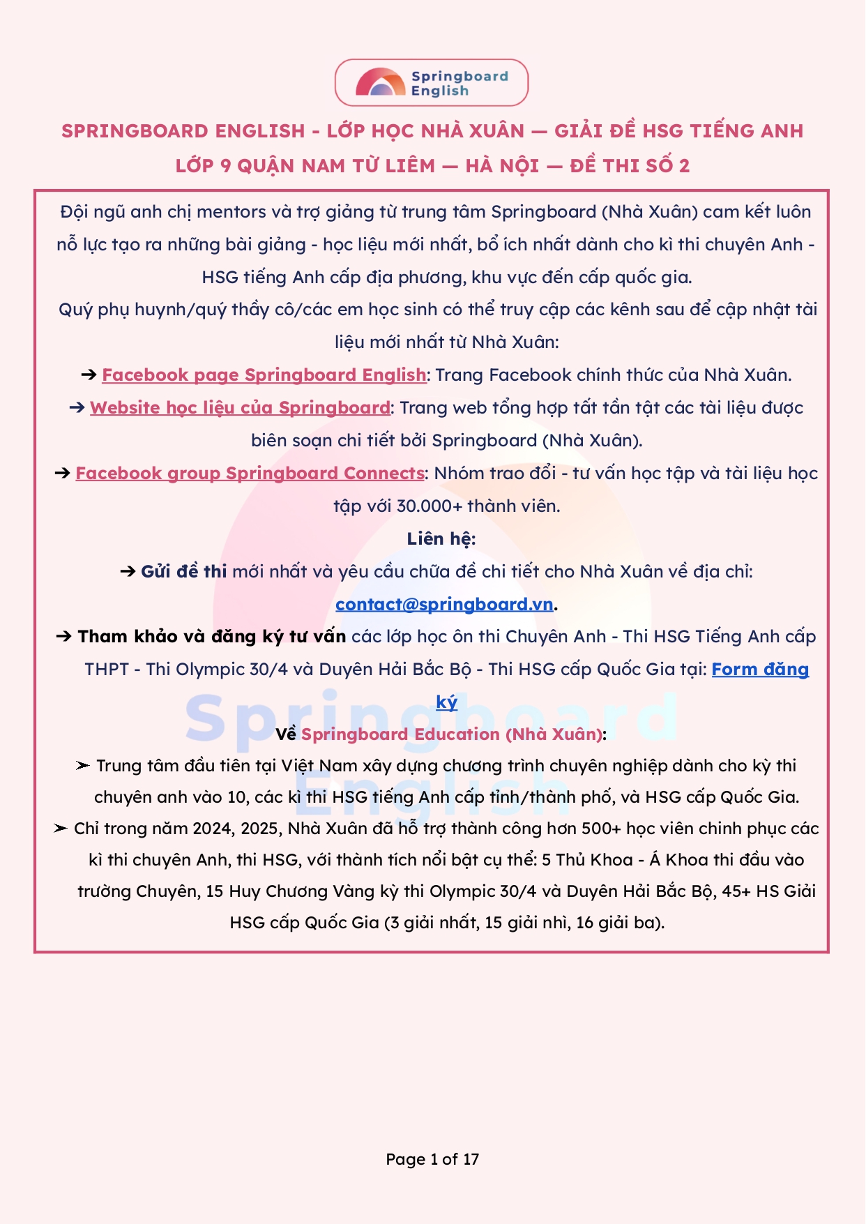 Đội ngũ anh chị trung tâm Springboard (Nhà Xuân) xin gửi đến các quý phụ huynh, thầy cô, các em học sinh tổng hợp đề thi và đáp án đề thi Học Sinh Giỏi lớp 9 Quận Nam Từ Liêm năm 2025-2026 (có đáp án và giải thích chi tiết).
