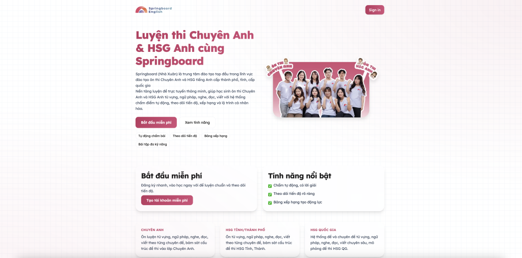 Trong bối cảnh đó, công nghệ giáo dục (EdTech) mở ra hướng đi mới: học sinh có thể luyện thi HSG Anh ngay trên máy tính — bài bản, hiệu quả và cá nhân hóa. Và trong số các nền tảng mới nổi, Springboard (app.springboard.vn) đang dần trở thành ứng dụng dẫn đầu trong luyện thi HSG Tiếng Anh và Chuyên Anh vào 10.