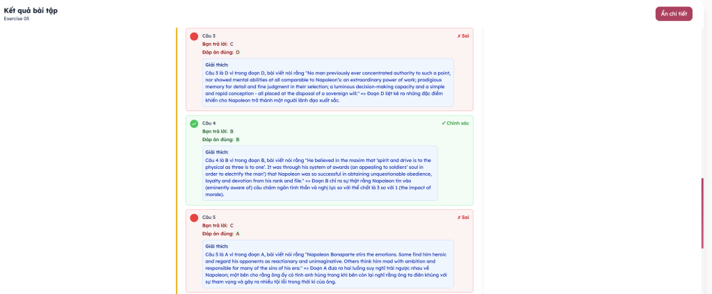Không chỉ cho đáp án, app còn có phần giải thích chuyên sâu: vì sao đáp án đó đúng, các lỗi tư duy phổ biến học sinh thường gặp, và mẹo làm bài hiệu quả.