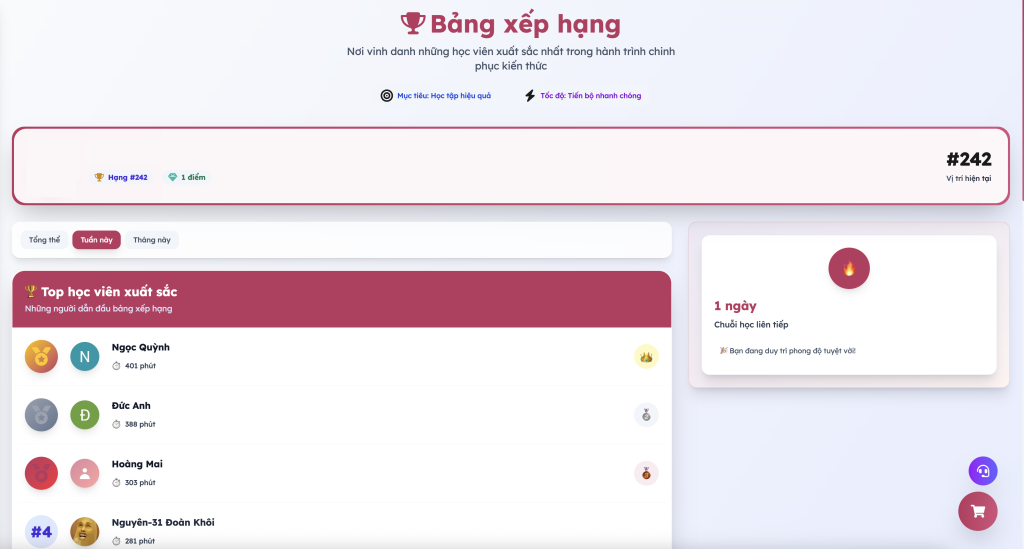 Bảng xếp hạng (leaderboard) giữa các học sinh